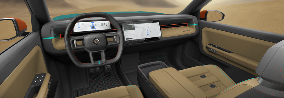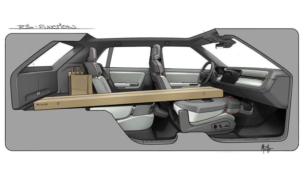 Rivian's expansion into a smaller segment, the R3 is a compact, rally inspired vehicle. The interior for the vehicle was an exercise in minimalism highlighting the strong Rivian DNA, paired down and wrapped around a central vent. In Rivian fashion, the reconfiguration of the interior with folding front and rear seats helped to make this a functional concept that punched above its weight in usability. Well executed and mature surfaces create a playground for CMF, as evidenced from the R3X variant.